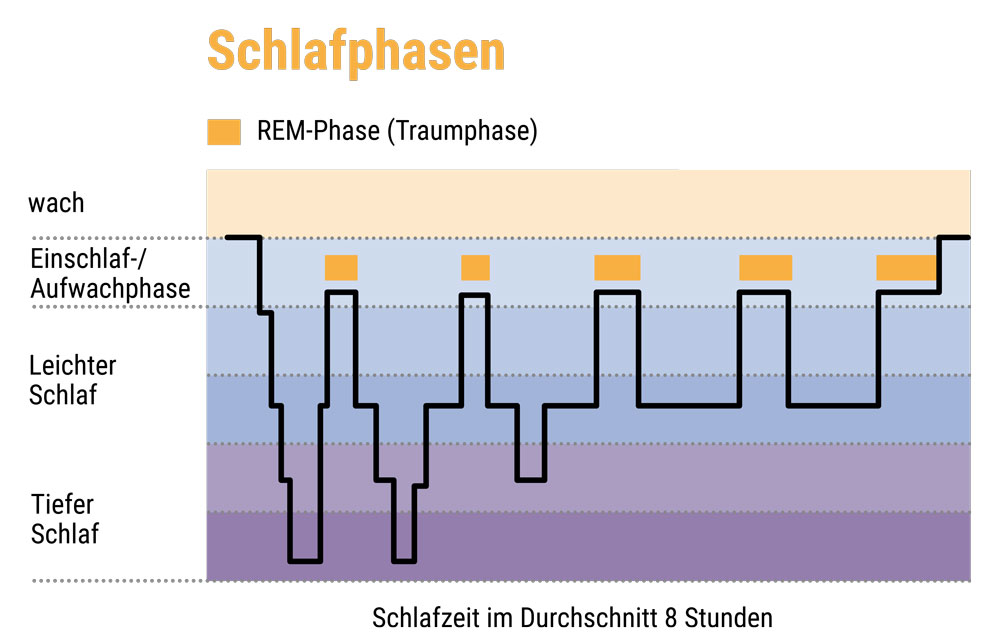 Wenn der Mensch schläft, durchläuft er im Schlaf verschiedene Phasen. Drei leichtere Schlafphasen, die Tiefschlafphase und die sogenannte REM-Phase, das ist die Traumphase. Man durchläuft diese Phasen treppenförmig – entweder die Treppe hinunter in die Tiefschlafphase oder danach wieder hoch in die Phasen mit leichterem Schlaf. Für einen erholsamen Schlaf braucht der Mensch eine bis 1,5 Stunden Tiefschlaf. Aber auch der REM-Schlaf ist wichtig, da er mit dem Lernprozess des Menschen gekoppelt ist. Die Abkürzung REM steht für Rapid Eye Movement, also „schnelle Augenbewegung“.